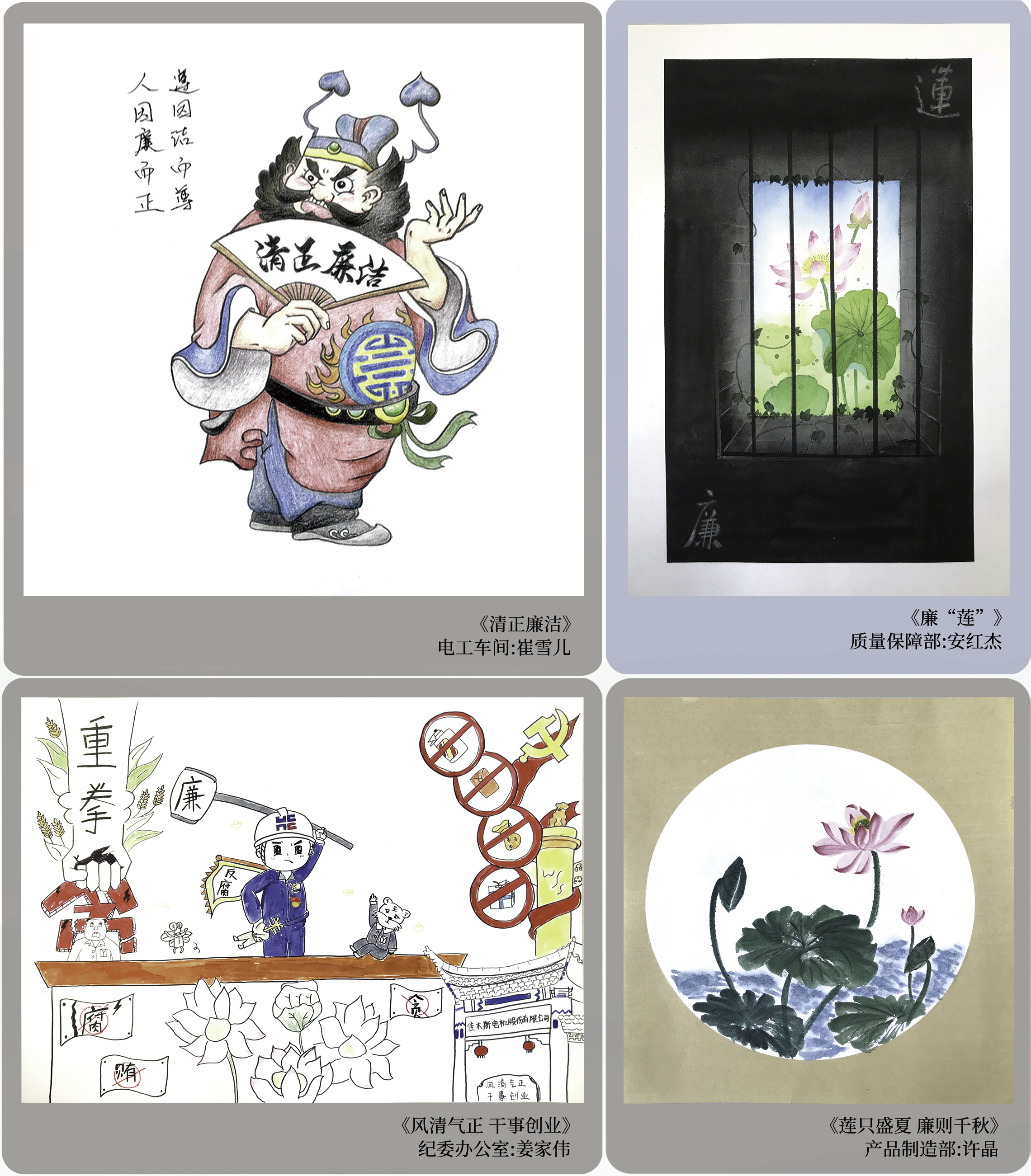 書畫言志,金石寄情。作品中既有以寓意廉潔高尚的“蓮”“竹”為元素的繪畫和幽默風趣、構思巧妙的漫畫,以廉政詩詞、格言警句為內容的書法作品,也有驚艷奪目、精美細膩的五谷粘貼手工藝品,還有通過職工視角、別具一格的構思,演繹拍攝出佳電廉潔文化故事。通過這些作品實現了廉潔文化與書畫藝術充分融合,增強了廉潔文化教育的吸引力、說服力、感染力和穿透力,展現了佳電股份廣大黨員干部職工防微杜漸、廉潔從業的信心和決心。