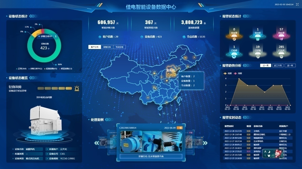 黨的二十大報告提出,堅持把發展經濟的著力點放在實體經濟上,推進新型工業化,加快建設制造強國、質量強國、航天強國、交通強國、網絡強國、數字中國。佳電股份依靠電機研發優勢,利用5G、人工智能、大數據等技術,專心研發智能電機,成立專項研發團隊。五年磨一劍,專注于智能電機底層技術,收獲了可喜的成果,推出了“設備全生命周期管理系統、軟硬算一體化解決方案”平臺,為設備運維管理決策提供數據支撐,實現了工業設備的預測性維護,提高了生產過程的連續性、可靠性和安全性。