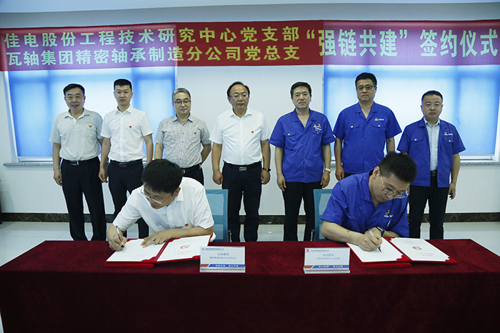 為深入貫徹落實哈電集團“三級書記抓質量”工作要求,深入開展“強黨性 精技術 提質量 優服務”主題黨日系列活動,積極向供應鏈延伸加大黨建共建力度,以黨建引領促進技術水平和產品質量提升,近日,哈電集團佳電股份工程技術研究中心黨支部與瓦房店軸承集團精密軸承制造分公司黨總支開展以“強鏈共建”為主題的聯建共建活動。并簽訂黨建共建協議。佳電股份黨委副書記劉漢成、瓦軸集團黨委副書記孫世成出席簽約儀式。瓦軸集團代表在公司領導陪同下參觀了企業展廳和生產車間。