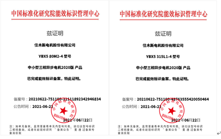 此次佳電股份自主研發設計的YBX5系列高效率隔爆型三相異步電動機,效率值優于最新國家標準GB18613-2020 (2021年6月1日正式實施)中的1級能效,即IEC60034-30-1-2014標準中的IE5,是目前國內高端的高效節能隔爆型異步電動機產品。從產品設計到典型規格試制再到小批量生產,每一階段均穩步進行,目前全系列電機(機座號80-355)已申報完成防爆合格證、節能認證(CQC)、能效標識等認證的辦理工作,已開始批量向市場供貨。
