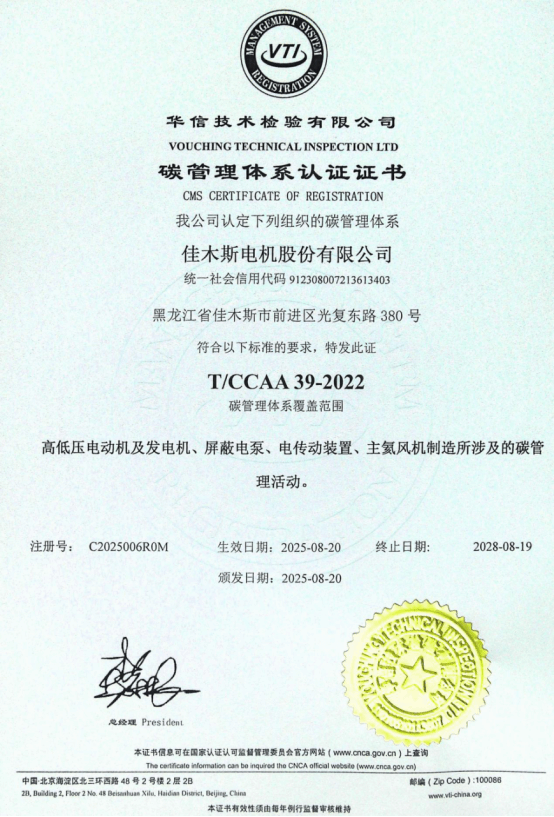 8月20日,哈電集團(tuán)佳木斯電機(jī)股份有限公司(以下簡(jiǎn)稱(chēng)“佳電股份”)順利通過(guò)華信技術(shù)檢驗(yàn)有限公司認(rèn)證機(jī)構(gòu)審核,榮獲碳管理體系認(rèn)證證書(shū),成為防爆電機(jī)行業(yè)首家獲得該認(rèn)證的企業(yè)。此次審核的通過(guò),標(biāo)志著佳電股份在碳排放管理、綠色低碳發(fā)展方面邁入新階段。