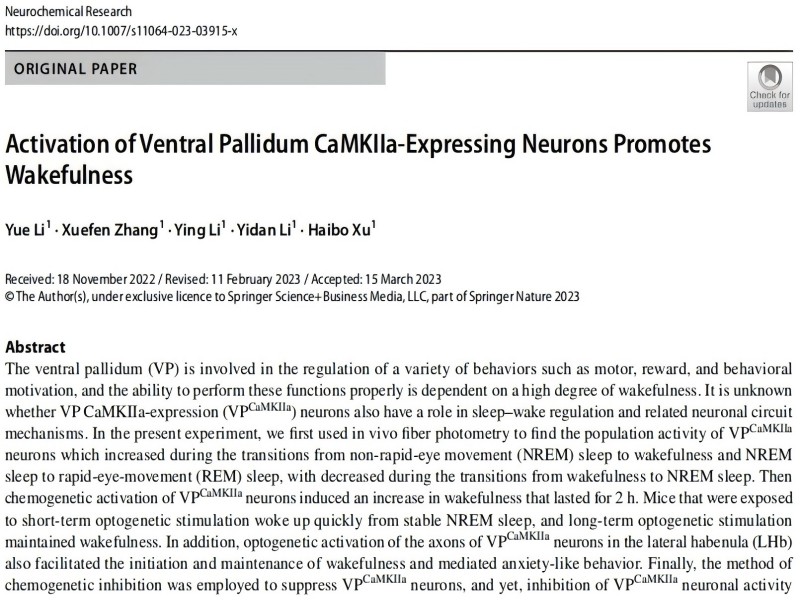 Neurochemical Research | 武漢大學(xué)徐海波課題組揭示激活腹側(cè)蒼白球CaMKIIα-表達(dá)神經(jīng)元促進(jìn)覺醒。