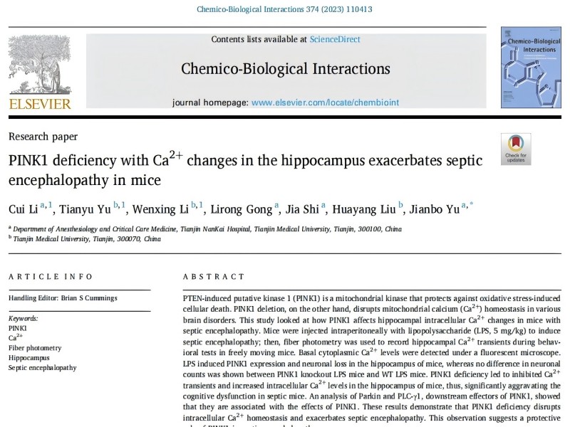 Chemico-Biological Interactions:天津醫(yī)科大學(xué)于建波課題組揭示PINK1缺失加劇小鼠膿毒癥性腦病中的海馬Ca2+變化