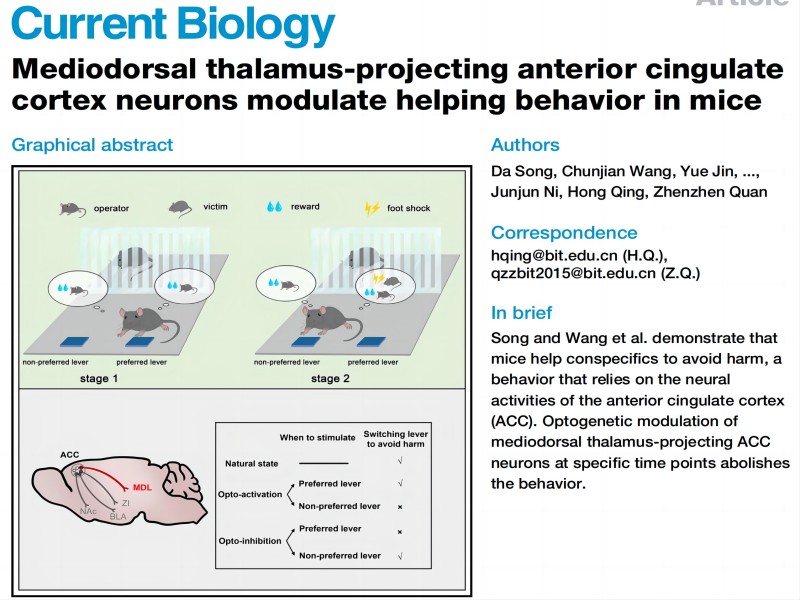Curr Biol丨北理工慶宏/全貞貞團(tuán)隊發(fā)現(xiàn)前扣帶皮層投射丘腦內(nèi)側(cè)的神經(jīng)元調(diào)節(jié)小鼠的幫助行為